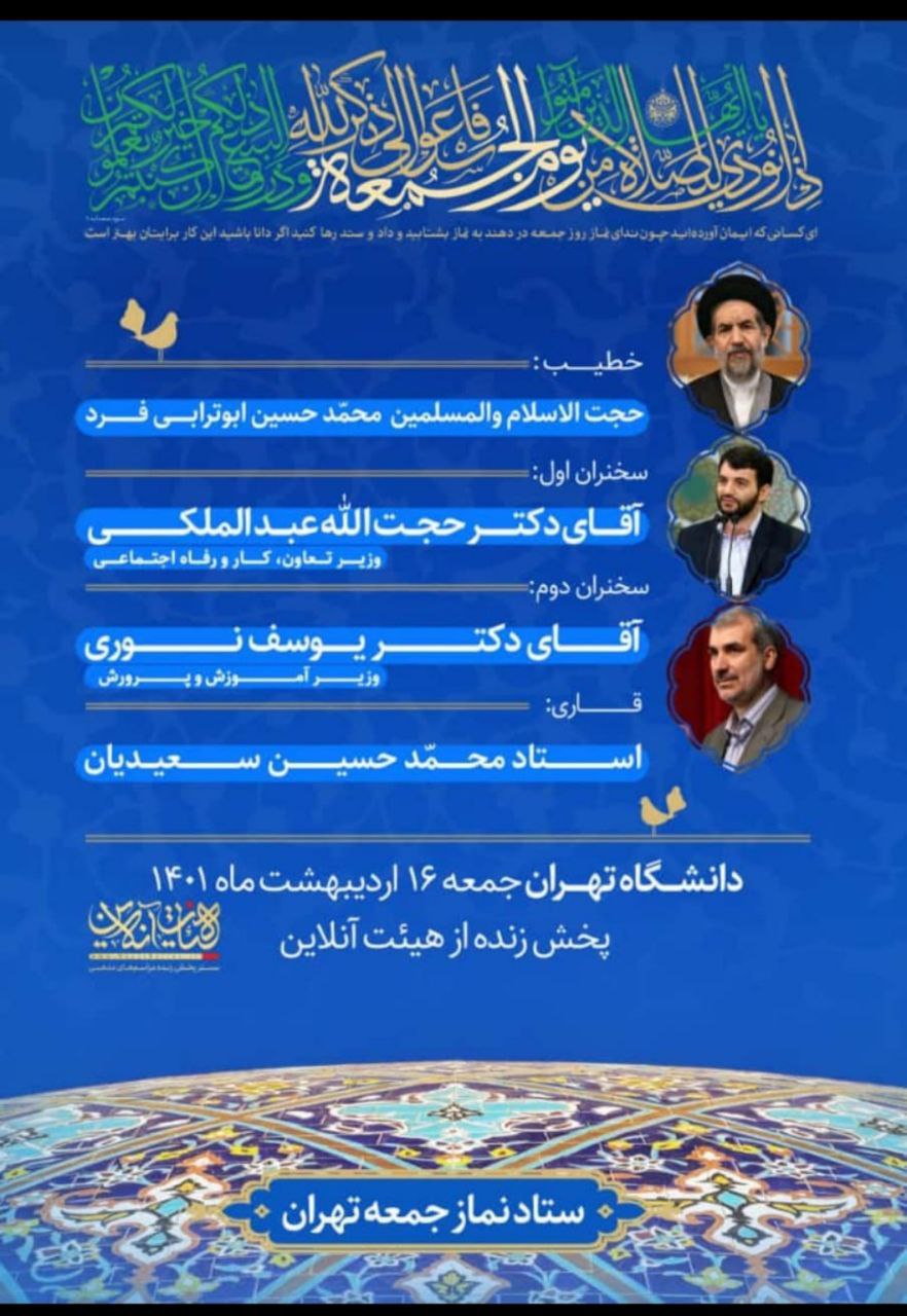 نماز جمعه این هفته تهران به امامت حجت الاسلام والمسلمین ابوترابی فرد در دانشگاه تهران برگزار می‌شود.